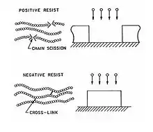 همان طور که از شکلهای ۵ و۶ مشخص است پس از تاباندن اشعه UV به ماده مقاوم، البته با گذر از ماسک، ماده مقاوم بسته به اینکه مثبت است یا منفی، استحکام آن به ترتیب کم یا زیاد میشود؛ لذا رفتار آنها در برابر محلول شیمیایی متفاوت خواهد بود، بدان معنا که برای ماده مقاوم مثبت، آن قسمتی که پرتو به آن تابیده شدهاست نسبت به آن قسمتی از آن که پرتو به آن تابیده نشدهاست از استحکام کمتری برخوردار بوده و لذا در اثر محلول شیمیایی خورده خواهد شد و در نتیجه الگوی ماسک روی زیرلایه به وجود خواهد آمد. در مورد ماده مقاوم منفی، همان طور که قبلاً اشاره شد نحوهٔ ایجاد الگو برعکس ماسک خواهد بود و اصول کار مشابه ماده مقاوم مثبت است.