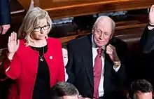 در حال سوگند خوردن برای نمایندگی، پدرش دیک چینی نظارهگر اوست