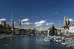 ![]() The Limmat in Zürich, looking downstream to Rathausbrücke from Quaibrücke at Lake Zurich, Stadthausquai to the left and Limmatquai to right. | |