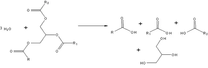 لیپازها موجب هیدرولیز استرها میشوند. درصورت وجود آب، استرتریگلیسریدها طبق واکنش فوق به اسید چرب تبدیل میشوند. لازم به ذکر است که R عبارت است از یک گروه آلکیل اشباعشده یا اشباعنشده.