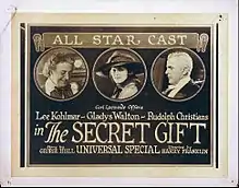 ![]() Lobby card for The Secret Gift (1920) with Lee Kohlmar, Gladys Walton, and Rudolph Christians | |