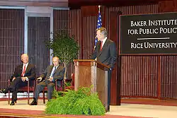 جیمز بیکر، جرج بوش پدر، و ولادیمیر پوتین در جلسهٔ سخنرانی برای دانشجویان در موسسه سیاستهای عمومی جیمز بیکر در دانشگاه رایس