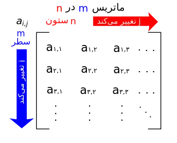 | ماتریس مربعی | n × n | ماتریسی با تعداد سطر و ستون برابر که گاهی برای نشان دادن نگاشت خطی از یک فضای بردار به خودش استفاده میشود مانند انعکاس و چرخش. |
