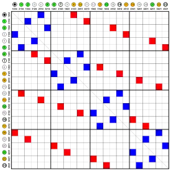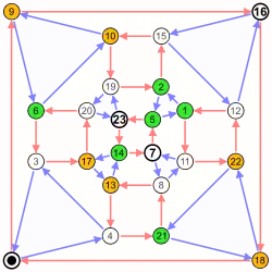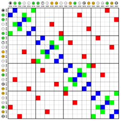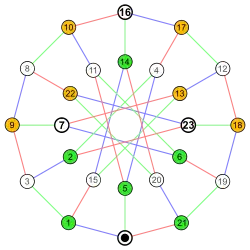 همآراییها ۰ تا ۲۳ هستند. درآیههای بیرنگ صفر و درآیههای رنگی یک را مینمایانند. چون گراف باسو است، ماتریس مجاورت ناهمامون (نامتقارن) است. |