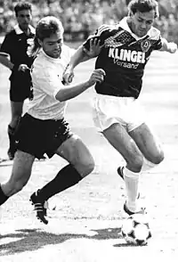![]() Döschner (right), being challenged by Stefan Marx of Lokomotive Leipzig in a match of 1990 | |||