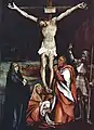 در تابلوی عیسی بر صلیب از قاب تزئینی محجر مذبح ایزنهایم، گرونوالد احتمالاً به یاد ماندنیترین تفسیر ممکن را از این موضوع در تاریخ هنر در برابر ما مجسم میسازد. این محجر از یک تابوت حکاکی شدهٔ چوبی با دو لوحهٔ قابل انتقال جانبی تشکیل شدهاست. در این قابها که در فاصلهٔ سالهای ۱۵۱۰ و ۱۵۱۵ برای مذبح کلیسای دیر رهبانان فرقهٔ قدیس آنتونیوس در ایزنهایم نقاشی شدند، سه صحنه دیده میشود که عیسی بر صلیب آخرین صحنه است و وقتی لوحهها بسته شوند دیده میشود. جنبهٔ اندوهبار این نقاشی را میتوان تا حدودی ناشی از استقرارش در بیمارستان دانست زیرا با اینکار میخواستهاند به بیماران بگویند که انسان دیگری، بیش از ایشان رنج و درد را تحمل کرد؛ عیس بر صلیب، یکی از چهار نسخهٔ شبیهسازی شده از این واقعه بود که برخی شان در جاهای مشابهی گذاشته شده بودند. لیکن، فقط نیروی تخیل شعله آسای گرونوالد بود که توانست چنین تصویر هولناک و اندوهباری از رنجهای عیسی پدیدآورد. پیکر مجروح، خونبار و بی جان عیسی بر زمینهای از تاریکی و تیرگی که بر طبق نص کتاب مقدس بر سطح زمین چیره شده است، با عضلات و جوارح به هم تابیده و زخمها و پارگیهای بیشمار مجسم شدهاست. در لحظهٔ مرگ، عذاب فوق طاقت آدمی، پاهای کبودش را میپیچاند، زیر بغلش را میشکافد، سر را به یک سو میآویزد، و انگشتها را کج و کوله میکند. برای پی بردن به سفتی و کشیدگی اعصاب و نمایش تک تک خطوط پیکر عیسی بر صلیب کافیست بکوشیم انگشتانمان را به حال انگشتان او درآوریم. هیچ هنرمند دیگری نتوانسته است چنین تصویری از زشتی رنج و درد بشر را به روی تابلوی نقاشی بیاورد. شکلهای گوشهدار و تیز ناشی از عذاب در پیکرههای از حال رفتهٔ مریم و قدیس یحیی و اندوه و حرمان و ماتم زدگی مریم ظاهر میشوند. در طرف دیگر، یحیی تعمید دهنده با آرامشی اطمینان بخش ایستاده است و با انگشتی به تیزی منقار پرنده به جسد عیسی بر صلیب اشاره میکند و سرنوشت عیسی را به عنوان رهاننده و سرنوشت خودش را به عنوان یک منادی صرف در کتیبهای لاتینی نشان میدهد :" شایسته آن است که فزونتر گردد و من کاسته تر شوم ."
