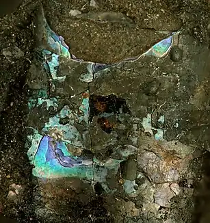 مادرمروارید رنگینتاب ظاهر میشود زیرا ضخامت پلاکتهای آراگونیت نزدیک به طولموج نور مرئی است. این ساختارهای تداخل امواج سازنده و مخرب با طول موجهای مختلف و زوایای دید مختلف باعث ایجاد رنگآمیزی ساختاری میشوند.