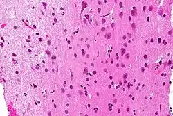 ![]() ریزنگارهای که ماده سفید با مشخصه ظاهر توری مانندش (سمت چپ تصویر - سایه روشنتر صورتی) و همچنین ماده خاکستری و مشخصه اجسام سلولی نورونی اش (سمت راست تصویر - سایه تیره صورتی رنگ)، در آن نشان داده شده. در این نگاره، از رنگ آمیزی HPS استفاده شده. | |