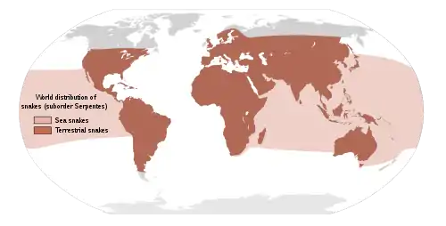 | گستره پراکندگی مارها در زمین (گسترهٔ حدودی مارهای دریایی به رنگ آبی) | |