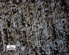 مارتنزیت (به انگلیسی: Martensite) فازی است که با یک تبدیل بدون پراکندگی، و برشی آستنیت در فولادها شکل میگیرد و ساختار اصلی فولادهای سخت شدهاست. از آنجایی که مارتنزیت در شرایط تعادل شکل نمیگیرد، در نمودار آهن-کربن نیز نشان داده نمیشود. بهطور کلی برای ایجاد مارتنزیت باید یک خنک کاری سریع تا زیر دمای بحرانی پایین (A1) انجام شود. همانطور که از نمودار آهن-کربن نیز انتظار میرود اگر فولاد تا زیر دمای A1 گرم شود، مارتنزیت در نهایت به فازهای سمنتیت و فریت تجزیه میشود.[1]