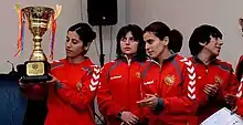 Mariam as captain of the team FC G.M. posing with the Cup Armenian Women's t tournament after the 2014–2015 season.