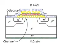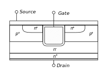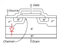 همانطورکه در شکل رو به رو دیده میشود، الکترود سورس به هر دو لایه +N و +P متصل است اما میدانیم که در ماسفت معمولی، پایه سورس تنها به لایه +N متصل میشود. حال اگر در ماسفت قدرت نیز بدین صورت عمل میشد، سبب معلق ماندن لایه +P مابین دو منطقه N (درین و سورس) میشود که معادل یک ترانزیستور NPN که پایه بیس آن به جایی متصل نیست، میشود. این ترانزیستور پارازیتی، سبب بهم خوردن عملکرد ماسفت در شرایط خاص میشود. اتصال الکترود سورس به هر دو لایه +P و +N سبب میشود که پایه بیس این ترانزیستور به پایه امیتر آن وصل شده و همانند یک دیود عمل کند.