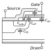 خازن CGD را میتواند همانند اتصال سری دو خازن اولیه دانست. اولی عبارت است از خازن اکسید (CoxD) که تشکیل شدهاست از الکترود گیت، عایق دیاکسید سیلیکون و قسمت بالای لایه +N و مقدار آن ثابت است. دومی خازن (CGDj) است که ناشی از گسترش ناحیه تخلیه در زمانی که ماسفت خاموش میباشد، است که در نتیجه مقدار این خازن تابعی از ولتاژ درین-سورس است. CGDj (و در نتیجه CGD) خازنی است که مقدار آن وابسته به ولتاژ گیت-درین است. اگر این ولتاژ افزایش یابد، مقدار ظرفیت خازن کم میشود. زمانی که ماسفت در حالت روشن است، CGDj به حالت موازی درآمده و بنابراین خازن گیت به درین برابر با CoxD که یک مقدار ثابت است، میشود.