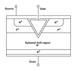 در VMOS از یک ساختار شیاری به شکل V استفاده شدهاست و برای اولین بار در المانهای تجاری بکار رفت.[3]