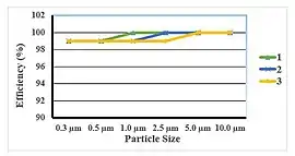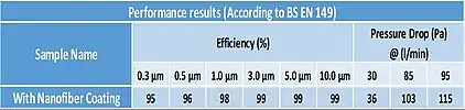 در جدول زیر کارایی بهداماندازی ذرات ۰/۳ میکرون تا ۱۰ میکرون مدیای پوشش دادهشده توسط نانوالیاف مشخص شدهاست.