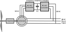 راه حل دیگر استفاده از ژنراتورهای تغذیه دوسویه است که در آنها به جای حالت معمول که در آن سیمپیچ روتور به منبع تغذیه DC متصل و سیمپیچ استاتور که برق تولید شده از خروجی آن گرفته میشود، دو سیمپیچ سه فاز داریم که یکی ثابت است و دیگری دوران میکند، یکی از سیم پیچها مستقیماً به خروجی متصل میشود و سیم پیچ دیگر به یک منبع AC سه فاز با فرکانس متغیر متصل میشود و این منبع روی فرکانسی قرار میگیرد که تغییرات در سرعت ژنراتور و طبعاً فرکانس برق تولیدی رو جبران میکند. برای تنظیم فرکانس این منبع به یک مبدل AC به DC به AC نیاز است که برای ساخت آن از نیمه هادیهای IGBT استفاده میشود. این مبدلها دو طرفه بوده و میتوانند برق را از هر دو جهت عبور دهند. عبور جریان برق از سیم پیچ متصل به تغذیه به خوبی عبور آن از سیم پیچ خروجیست.