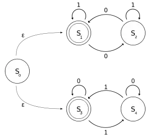 فزض کنیم M یک NFA-ε است با الفبا دودویی {0،1}، به طوریکه ورودی شامل تعداد زوج ۱ یا تعداد زوج ۰ است.