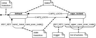 همچنین، یالهای این گراف که نشاندهنده انتقالهای بین حالتها هستند، شامل شرط و عمل هستند که به اینگونه بر روی یال قرار میگیرند: عمل / شرط