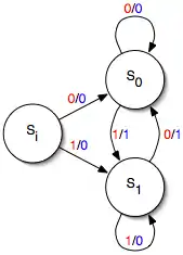یک ماشین میلی ساده یک ورودی و یک خروجی دارد. هر لبهٔ انتقال با یک مقدار ورودی (که در تصویر با رنگ قرمز نشان داده شده) و یک مقدار خروجی (رنگ آبی) برچسب گذاری شده. حالت شروع ماشین Si است.