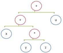 کامپایلرهای برای ماشین پشتهای سادهتر و سریعتر از کامپایلرها برای سایر ماشینها هستند. تولید کد بسیار جزئی و مستقل از کد اولیه یا کد بعدی است. برای مثال، برای دستور x+y*z+u، درخت معادل به صورت روبرو است: