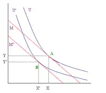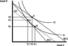 اثر درآمدی متغیر بودن مقدار کالا y را به علت تغییر در درآمد واقعی نشان میدهد و اثر جانشینی تغییر مقدار کالا y را به علت تغییر قیمتهای نسبی کالاها. این نوع مالیات (که باعث اثر جایگزینی میشود) را میتوان سو دهی (جهت دهی به تصمیم مصرفکننده) دانست.