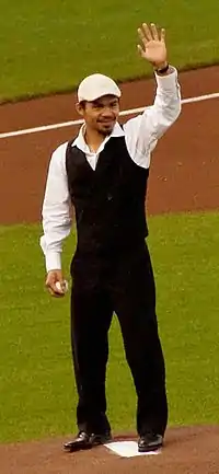 ![]() Pacquiao during the ceremonial first pitch at a baseball game | |