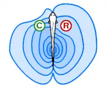 مغز یک ماهی به چندین ناحیه تقسیم میشود. در پیش، پیاز بویایی قرار دارد. یک ساختار زوج که سیگنالهای فرستاده شده از سوراخهای بینی را به کمک دو عصب بویایی، دریافت و پردازش میکند.[46] برای ماهیهایی که با کمک حس بویایی شکار میکنند مانند کوسهها، گربه ماهیها و بیفکماهیها، پیاز بویایی بسیار بزرگ است. در پشت پیاز بویایی، دو عضو با ساختاری همانند مخِ آبپردهداران پیشرفته وجود دارد. در ماهیها، مخ بیشتر درگیر حس بویایی است.[46]