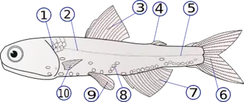 (۱) پوشش آبششها، (۲) خط جانبی، (۳) بالهٔ پشت، (۴) بالهٔ گوشتی، (۵) ساقهٔ دم، (۶) بالهٔ دم، (۷) بالهٔ مقعد، (۸) نقطههای تابناک، (۹) بالههای لگنی (جفت)، (۱۰) بالههای سینهای (جفت)