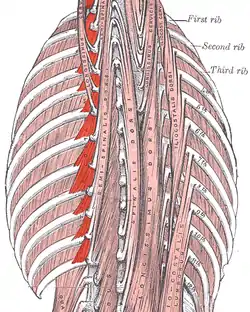 ![]() Deep muscles of the back. (Levatores costarum labeled vertically at center left.) | |