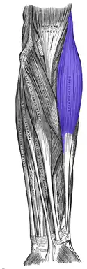 ![]() Anterior view of muscles of the left forearm with brachioradialis shown in blue | |