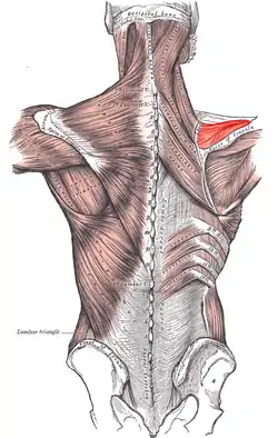 ![]() نمای پشتی از ماهیچههای متصل کننده اندام فوقانی به ستون مهرهای. ماهیچه سوپرااسپیناتوس در سمت راست با رنگ قرمز نشان داده شدهاست، در حالیکه در سمت چپ توسط سایر ماهیچهها پوشیده شدهاست. | |