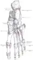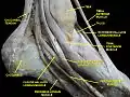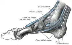 ![]() The mucous sheaths of the tendons around the ankle. Medial aspect. (Tibialis posterior labeled at top center.) | |
