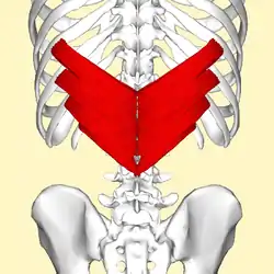 ![]() Muscles connecting the upper extremity to the vertebral column (serratus posterior inferior labeled at center right). | |