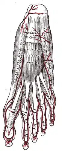 ![]() Superficial view of the plantar arteries (abductor digiti minimi visible at center right). | |
