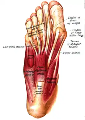 ![]() First layer of muscles of the sole of the foot (abductor hallucis visible at lower right) | |