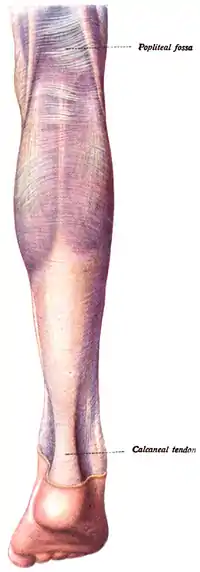 ![]() Posterior view of the human calf with the triceps surae. (Two heads of the gastrocnemius visible at first) | |