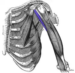 ![]() Deep muscles of the chest and front of the arm, with the boundaries of the axilla. Coracobrachialis is shown in blue. | |