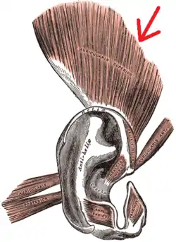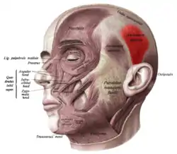![]() Face and neck muscles. Superior auricular muscle shown in red. | |