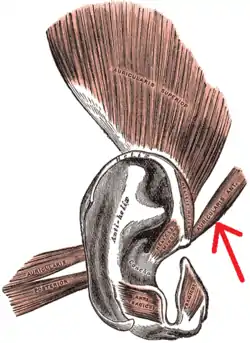 ![]() The گوش بیرونی. Anterior auricular is at right (indicated by the red arrow). | |