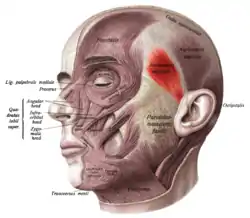 ![]() Face and neck muscles. Anterior auricular muscle shown in red. | |