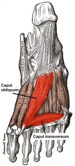 ![]() Muscles of the sole of the foot. Third layer. (Oblique head visible at center, and transverse head visible at bottom. | |