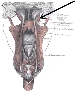 ![]() Dissection of the muscles of the کام from behind (tensor veli palatini visible at upper right). | |