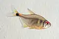 یکی از قدیمیترین و پر طرفدارترین ماهیهای تترا میباشد. نیمه بالایی چشمهای درخشندگی شعلهای قرمزی دارد که با نقطهای مشابه بالای لکه سیاه در جلوی باله دمی، هماهنگ است. ماهی نر به خاطر داشتن نقطه سفید کوچک در جلوی باله مخرجی، مشخص است. این گونه بومی آمریکا جنوبی است، اما امروزه در تعداد زیاد، در آکواریومها تکثیر و به بازار عرضه میشود. درازای آن به حدود ۴ سانتیمتر میرسد.[8]