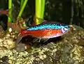 یک ماهی آکواریومی تماشایی و عالی است، رنگ در کل قرمز همراه با نقطه بیشتر و در ماده، با نوکهای قرمز است. این گونه در برزیل و گینه یافت میشود و درازای آن به ۵ سانتیمتر میرسد.[9]