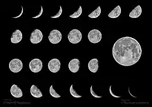 همیشه ۵۰ درصد سطح ماه در معرض نور خورشید قرار دارد. میزان ناحیه روشن ماه، به موقعیت ماه نسبت به زمین و خورشید بستگی دارد. اندازه ناحیه قابل رویت، از کاملاً تاریک تا ماه کامل متغیر است. این دوره کامل هشت مرحله دارد که اهله ماه نامیده میشوند. چرخه گامهای ماه، هر ۲۹٫۵۳ روز کامل میشود.