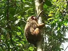 | Stump-tailed macaque range (blue – native, red – introduced, orange – possibly extinct) | |