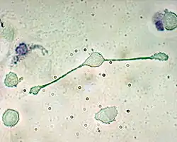 ![]() ماکروفاژی در موش که "بازوان" خود را کشیده است (فیلوپودیا)[1] تا دو ذره که احتمالاً بیماریزا هستند را فرو برد. رنگآمیزی با تریپان آبی. | |