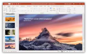 ![]() یک عکس از ارائه ساخته شده و ویرایش شده در پاورپوینت، اجرا شده در ویندوز ۱۰ | |