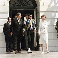 در ۱۴ مه ۱۹۸۴ مایکل به کاخ سفید دعوت شد تا جایزهای را از دستان رونالد ریگان، رئیسجمهور وقت آمریکا دریافت کند. این جایزه برای قدردانی از حمایتهای جکسون از حرکتهای خیریه علیه اعتیاد به نوشیدنیهای الکلی و مواد مخدر به او داده شد. مایکل از ترانهٔ «بزن به چاک» برای این اقدامات استفاده کرد. بازدید مایکل از کاخ سفید، هیجانانگیزترین اتفاق این کاخ، بعد از آزادی گروگانهای سفارت آمریکا از ایران در تاریخ ۲۰ ژانویه ۱۹۸۱ بود.[60] رونالد ریگان با این جملات از مایکل ۲۵ ساله قدردانی کرد: