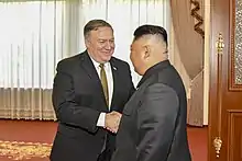 مایک پومپئو در تعطیلات عید پاک سال ۲۰۱۸ از کره شمالی بازدید و با کیم جونگ-اون رهبر این کشور برای بحث در خصوص دیدار بین کیم و ترامپ دیدار کرد.[14] پومپئو معمولاً گزارش روزانه اطلاعاتی به رئیسجمهور را شخصاً ارایه میداد.[15]